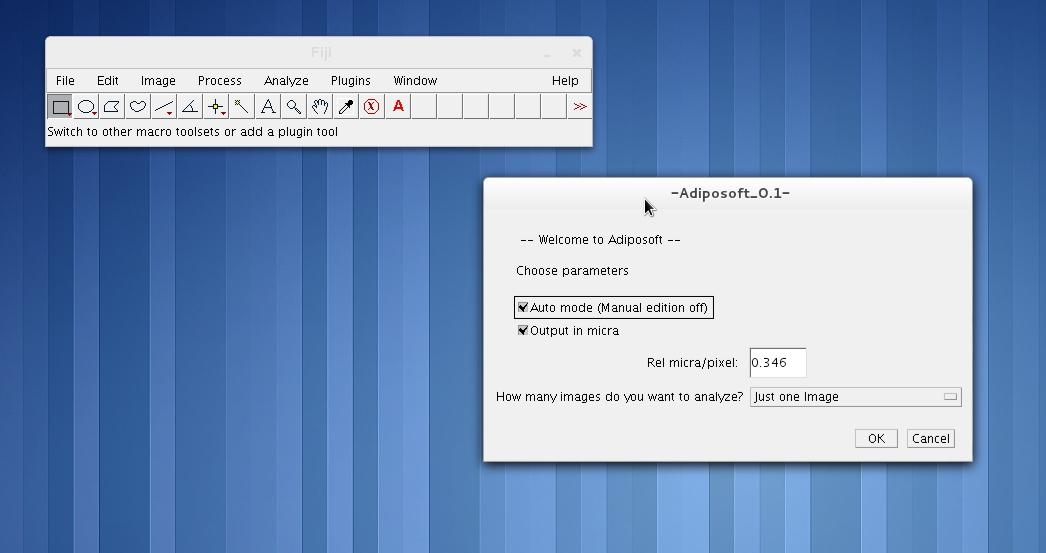 Go to the Plugins menu in Fiji, and click on Adiposoft. This will open the main Adiposoft dialogue window.