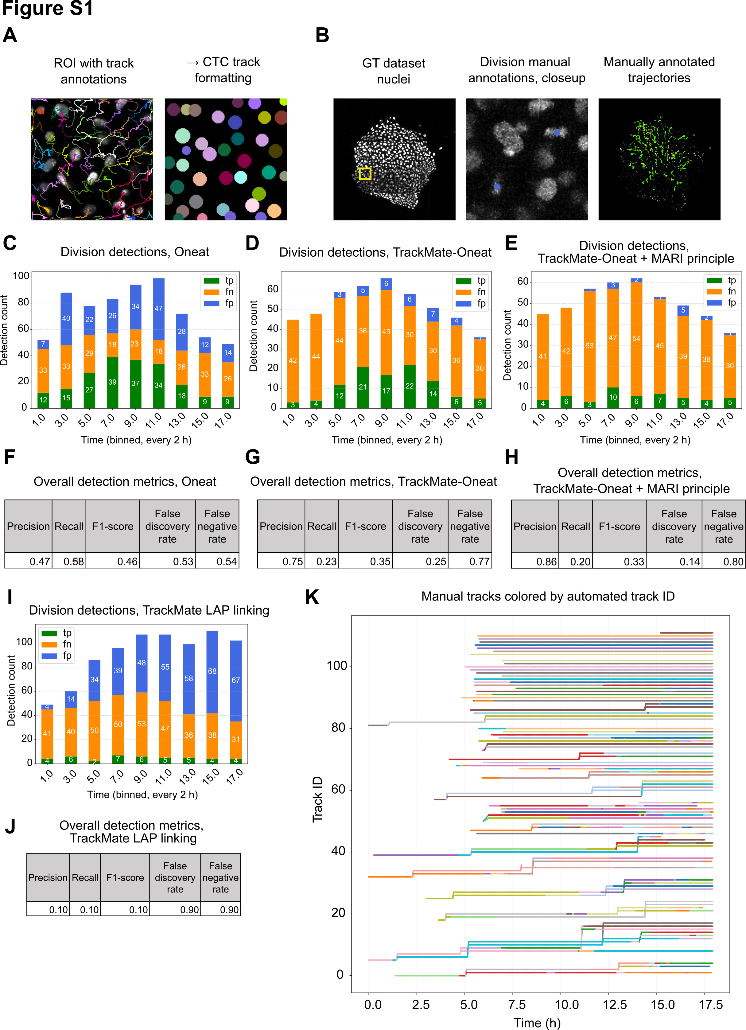 Quality metrics for tracking and division detection. A-B. Division metrics in C-J are based on a dataset where each cell division is manually annotated (B). In this dataset, selected tracks are also annotated and compared to automated tracking in Table S3 and panel K. C-E, I. Division detections for Oneat (not connected with tracks), TrackMate-Oneat (Oneat divisions connected with TrackMate tracks), TrackMate-Oneat + MARI principle (TrackMate-Oneat with max boundary set for angle between mother cell and daughter cells), and TrackMate “native” track splitting, enabled in TrackMate LAP linking algorithm. F-H, J. Corresponding detection metrics. K. Manually annotated ground truth tracks colorized by the Track ID assigned by automatic tracking used for the experiments.