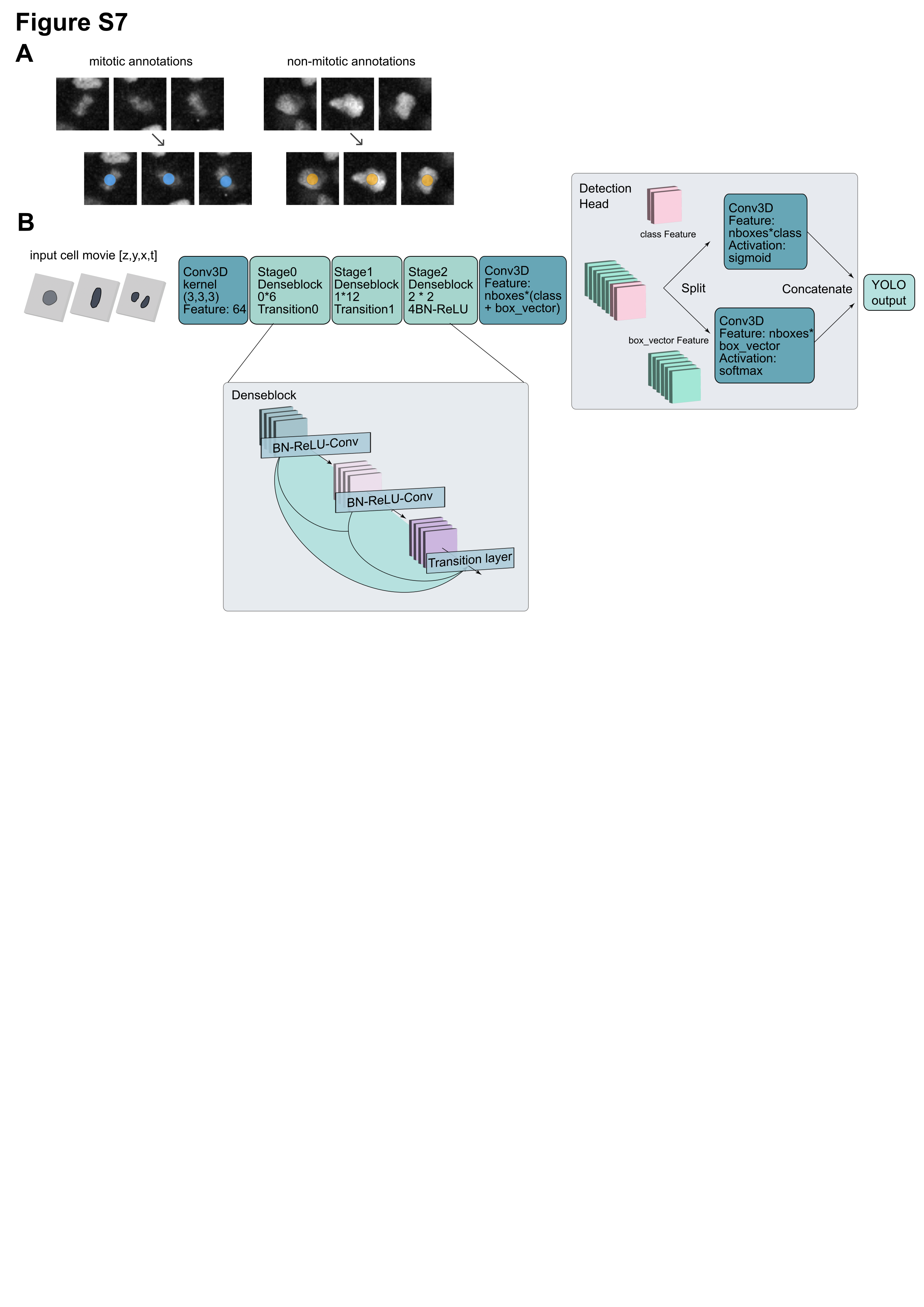 We developed a pipeline leveraging deep learning-based action classification to detect cell division events and use these predictions to improve nucleus tracking. A key component of this system is the Oneat classifier, which was trained to distinguish mitotic from non-mitotic cells based on short temporal sequences of image data. For training, the 3D+t nucleus channel of a dataset was manually annotated for division events. Specifically, mitotic events are annotated on Napari by clicking on the center of the dividing nucleus in a microscopy time series. For each annotated division, a 64 x 64 x 8 voxel crop of 3 time frames was extracted around the clicked location, centered both spatially and temporally on the mitotic event. This creates a positive training sample. To create negative (non-mitotic) samples, a corresponding number of randomly selected locations are extracted from non-dividing nuclei. These negative and positive samples are used to train the model in a supervised fashion, optimizing a binary classification loss to distinguish mitosis from non-mitosis using a DenseNet-based architecture.